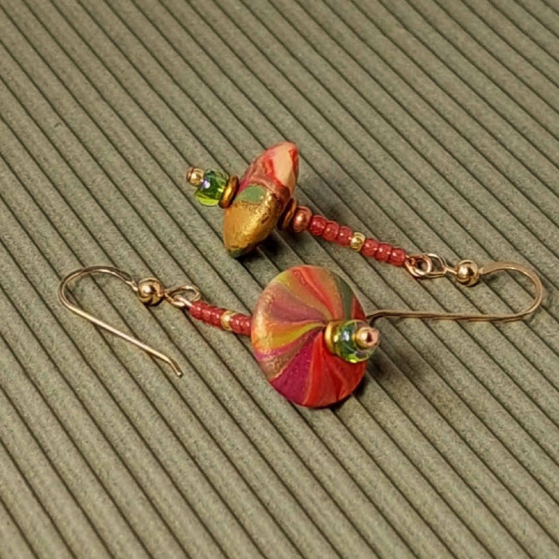 Each handmade polymer clay bead has a swirl pattern made with rich warm clay colors--orange, red, gold, and sage. Accents include rose copper, copper, and gold beads at the top and gold and iridescent green beads underneath each polymer bead. Gold-plated stainless steel ear wires complete each earring. Sage and Spice Earrings are so lightweight you'll barely feel them in your ears. Together, these earrings weigh less than 1/4 ounce.
